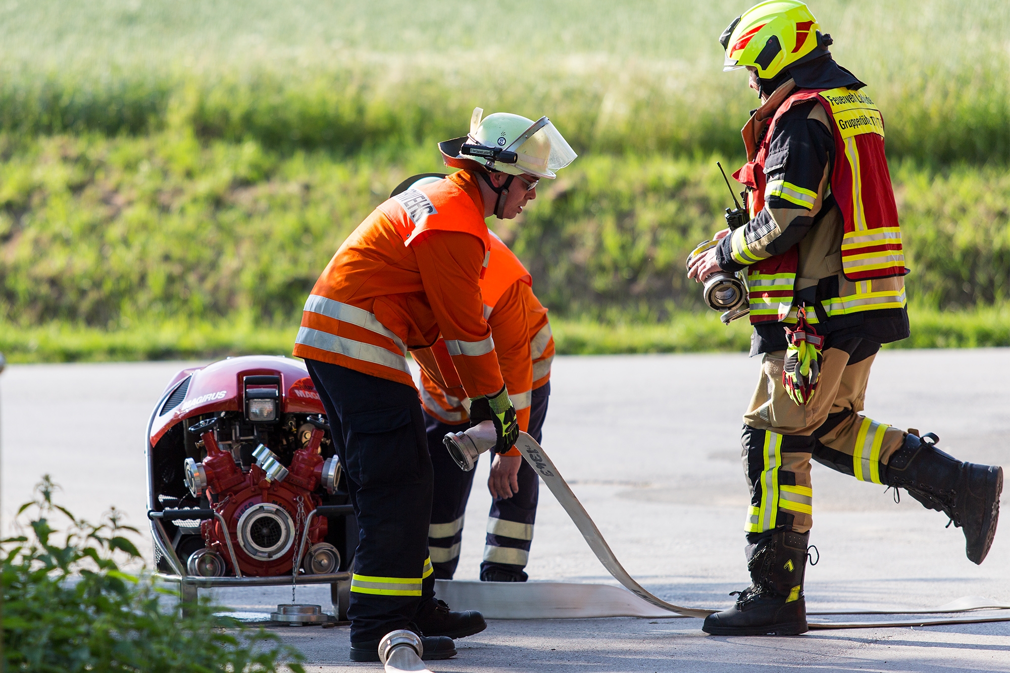 Das Feuer hatte sich mittlerweile auch im Gebäude ausgebreitet. Der Abschnittleiter des Abschnitt 1 erhielt von der Geschäftsführung die Information, dass mindestens 5 Mitarbeiter vermisst werden. Sofort wurden mehrere Trupps zur Menschenrettung ins Gebäude entsandt. Mit dem Monitor der Drehleiter wurde eine Riegelstellung zum Dachstuhl der Produktionshalle vorgenommen. Für den Abschnitt 2 war die Wasserentnahmestelle in der Katzensteinerstraße im Bereich der Brecheranlage vorgesehen. Die Feuerwehr Badenhausen erhielt den Einsatzauftrag zum Herrichten der Wasserentnahmestelle, des setzten einer Verstärkerpumpe im Bereich Katzensteinerstraße/ Obere Steinbreite und der Verkehrssicherung im Kreuzungsbereich an der Bahn. Die Feuerwehr Freiheit setzte im Bereich Lasfelder Straße/ In der Klapper eine Verstärkerpumpe und stellte hier auch eine Verkehrssicherung. Insgesamt legte der GW-L2 eine Förderleitung von ca. 1600 Meter Länge und einem Förderstrom von ca. 1000 Liter pro Minute. In der Atemschutzsammelstelle wurden insgesamt 16 Trupps registriert und koordiniert. Von den 16 Trupps wurden im Einsatzverlauf 15 eingesetzt. Die Atemschutzsammelstelle koordinierte außerdem den Tausch benutzter Atemschutzmasken und das Füllen der leeren PA-Flaschen. Im Abschnitt 4 wurden die 5 Verletzten Personen durch die SEG betreut und behandelt. Der ELW Osterode unterstützte den Einsatzleiter der Feuerwehr Lasfelde und übernahm die Gesamtkoordination von ca. 100 Einsatzkräften, dies war die erste größere Bewährungsprobe für das neue Einsatzmittel. Nach gut 2 Stunden wurde vom Einsatzleiter Übungsende gegeben. Nach Rückbau aller Gerätschaften gab es bei Kaltgetränken und Wurst vom Grill eine Nachbesprechung am Feuerwehrhaus. Die Feuerwehr Lasfelde bedankt sich bei allen Ensatzkräften für die gute Zusammenarbeit. Ein Besonderer Dank gilt den Darstellern der Verletzten, Übungsbeobachtern , dem Vertreter der Presse und Andre‘ Tuschek für die Bilder.